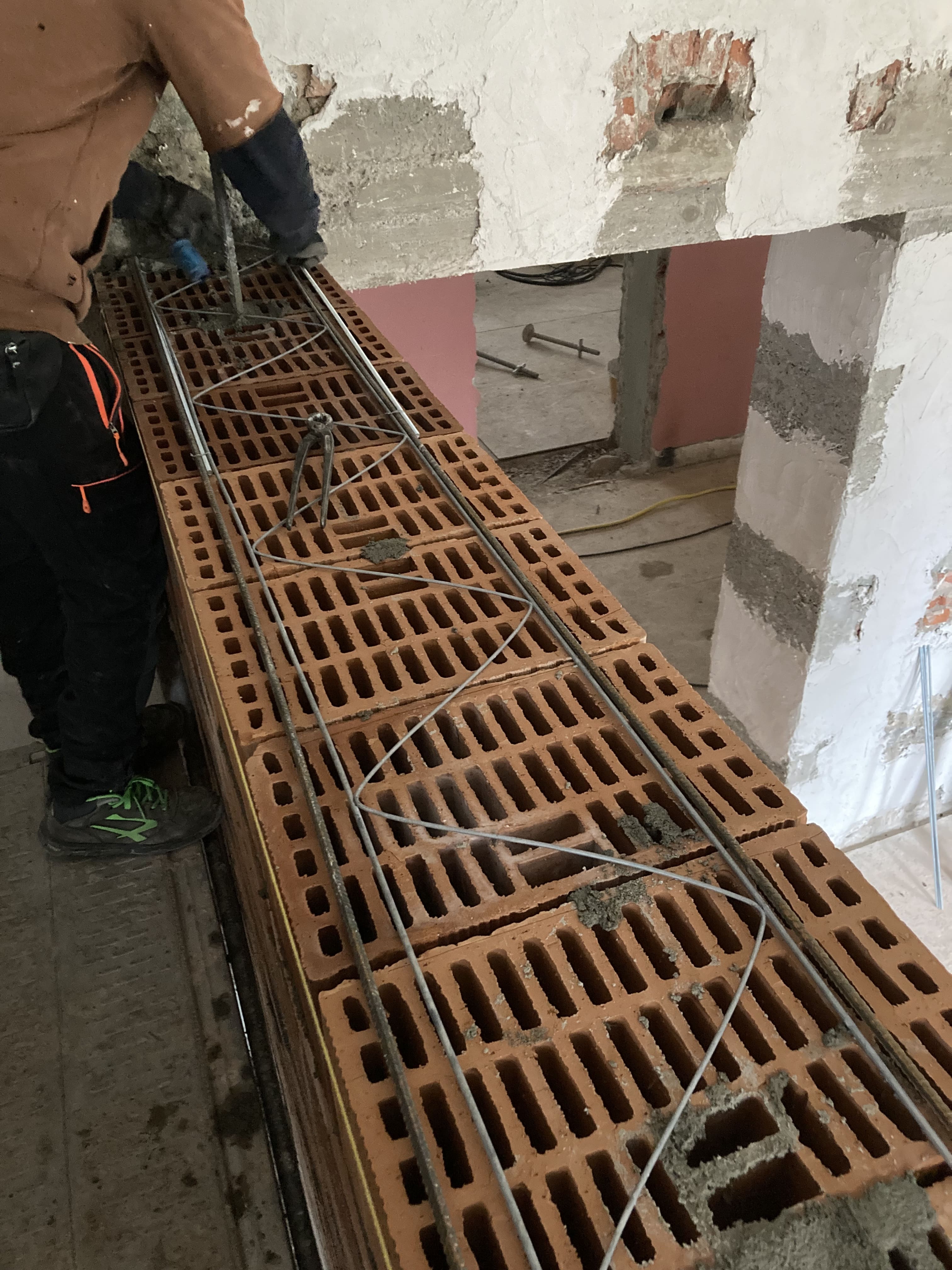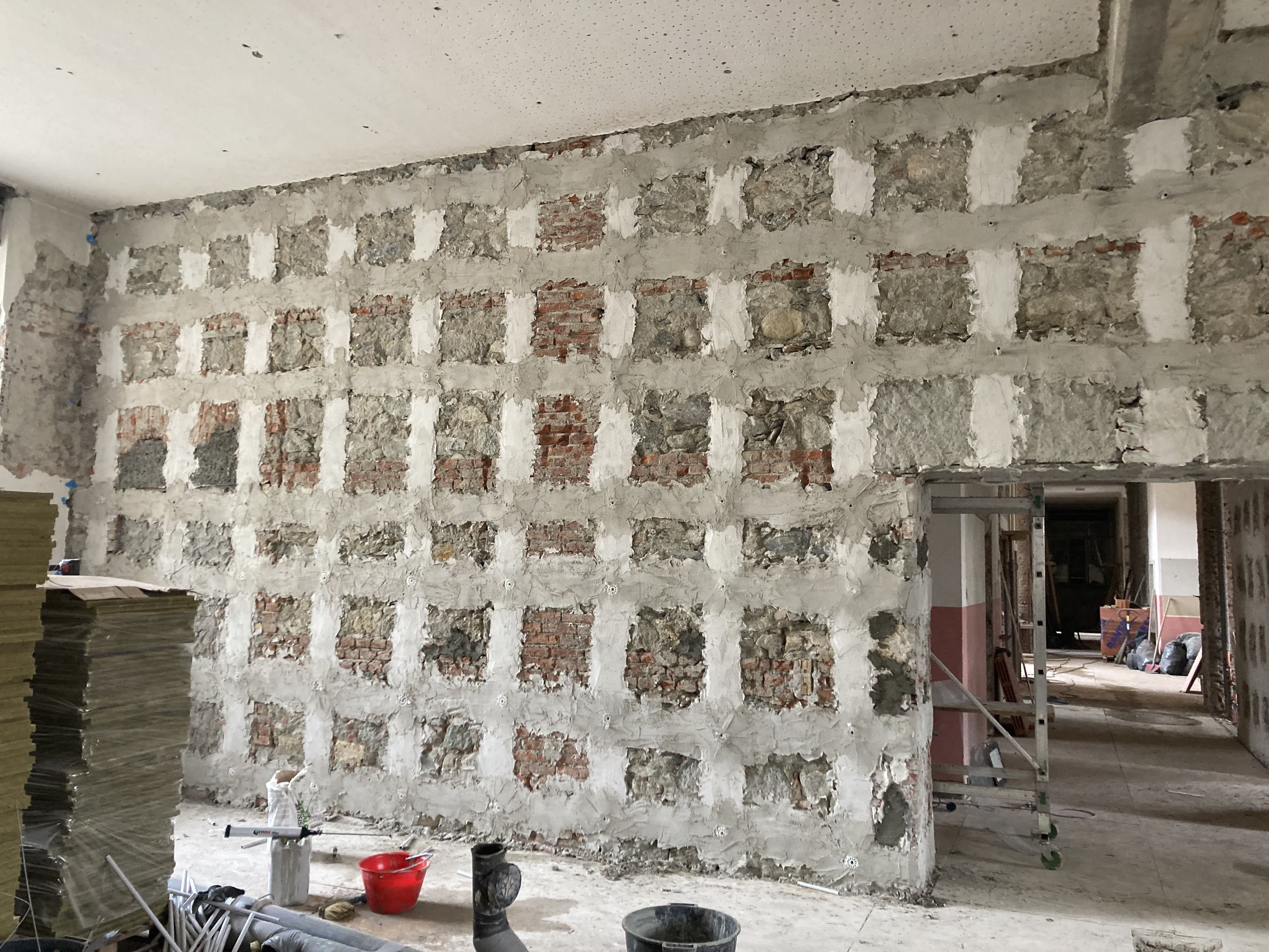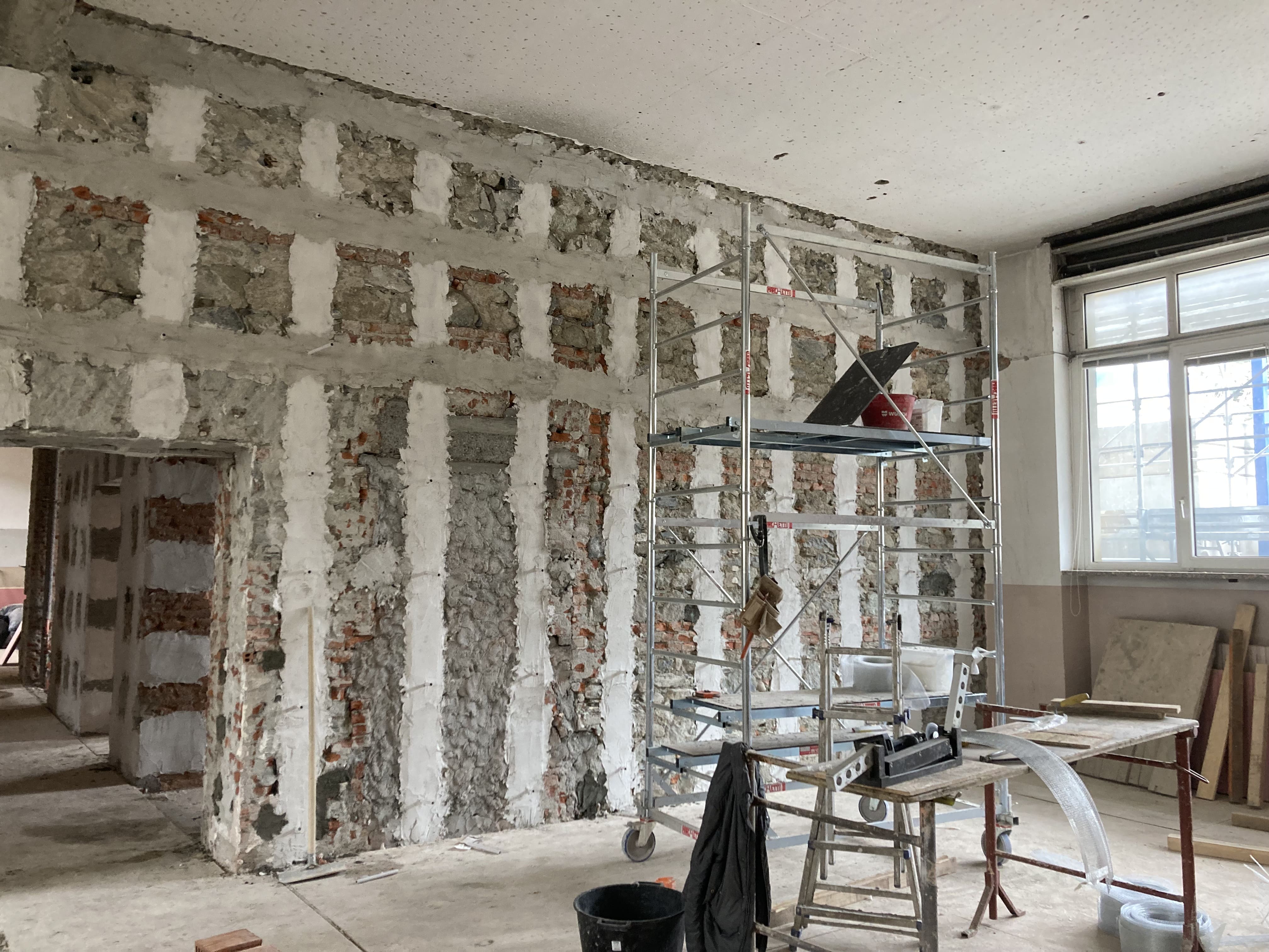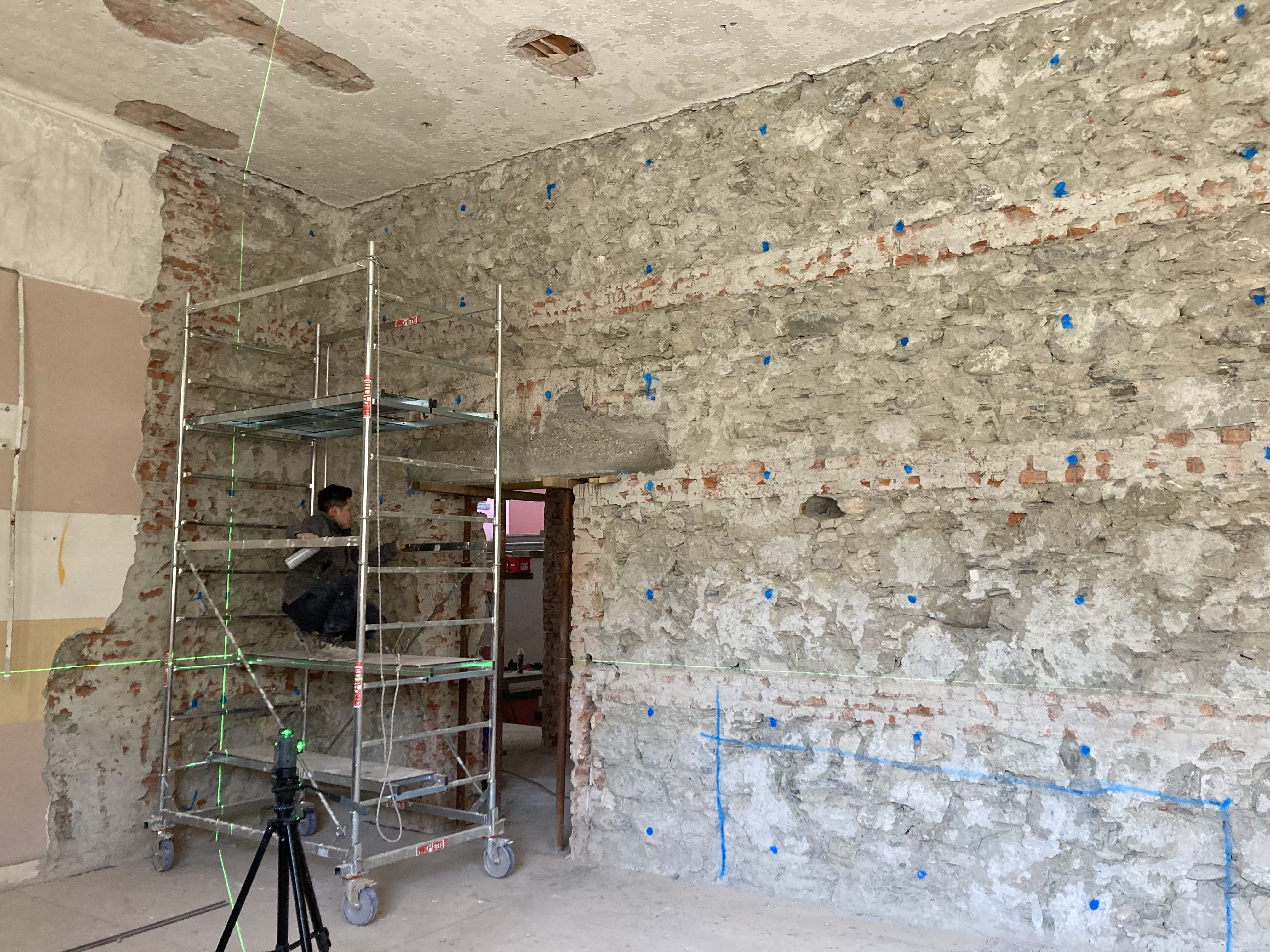 Procedono le lavorazioni previste per il consolidamento dell’edificio. In questa fase sono in corso gli interventi di posa dei sistemi di rinforzo strutturale sui maschi murari, finalizzati a migliorare il comportamento dell’edificio in caso di sisma. Parallelamente si sta procedendo alla realizzazione dei nuovi architravi in calcestruzzo armato per l’allargamento delle aperture esistenti. Sono inoltre in corso le lavorazioni per la realizzazione delle murature armate al piano terra, insieme a demolizioni puntuali delle parti non più necessarie, con le relative operazioni di pulizia delle aree di lavoro e smaltimento dei materiali di risulta.