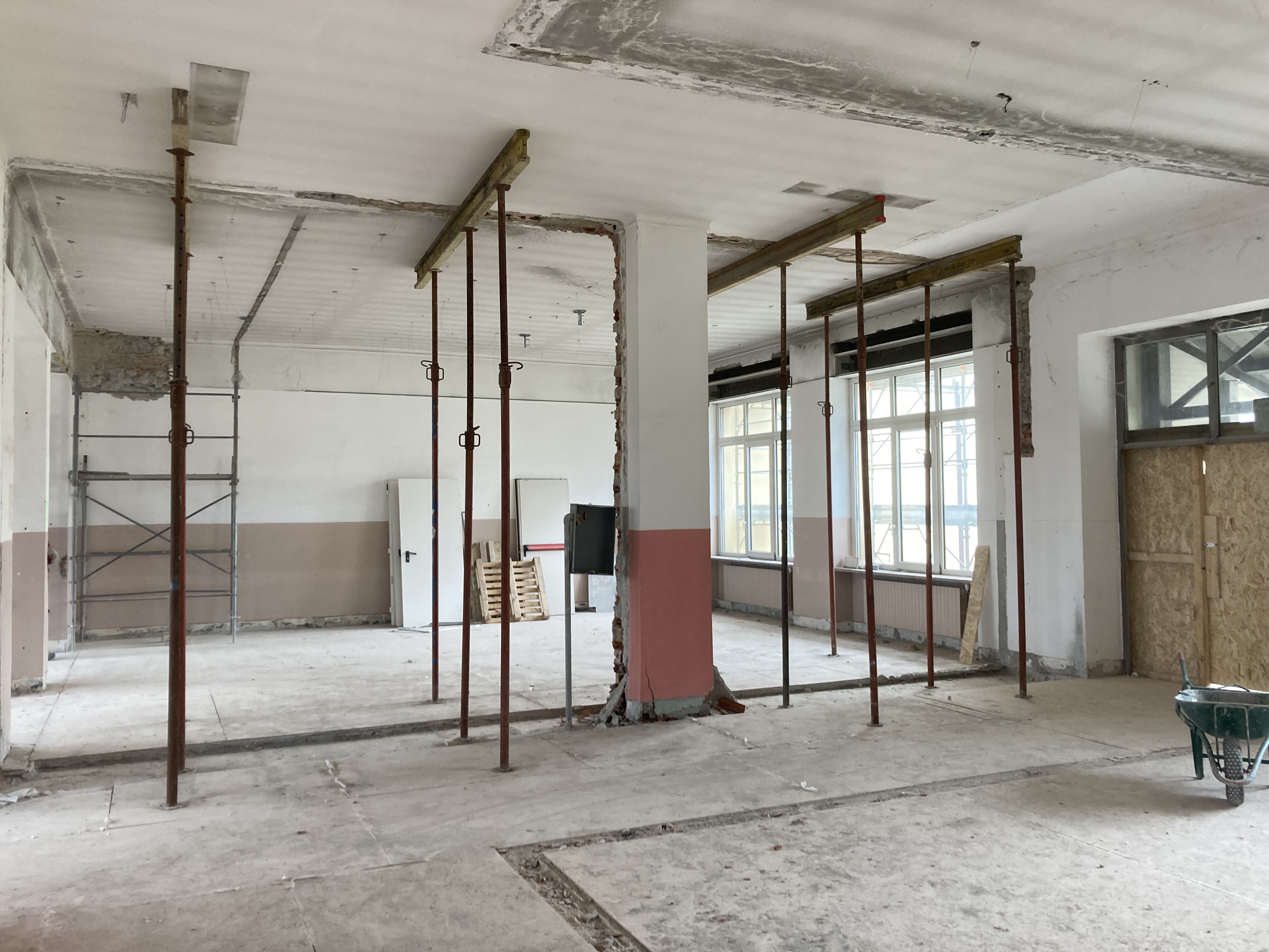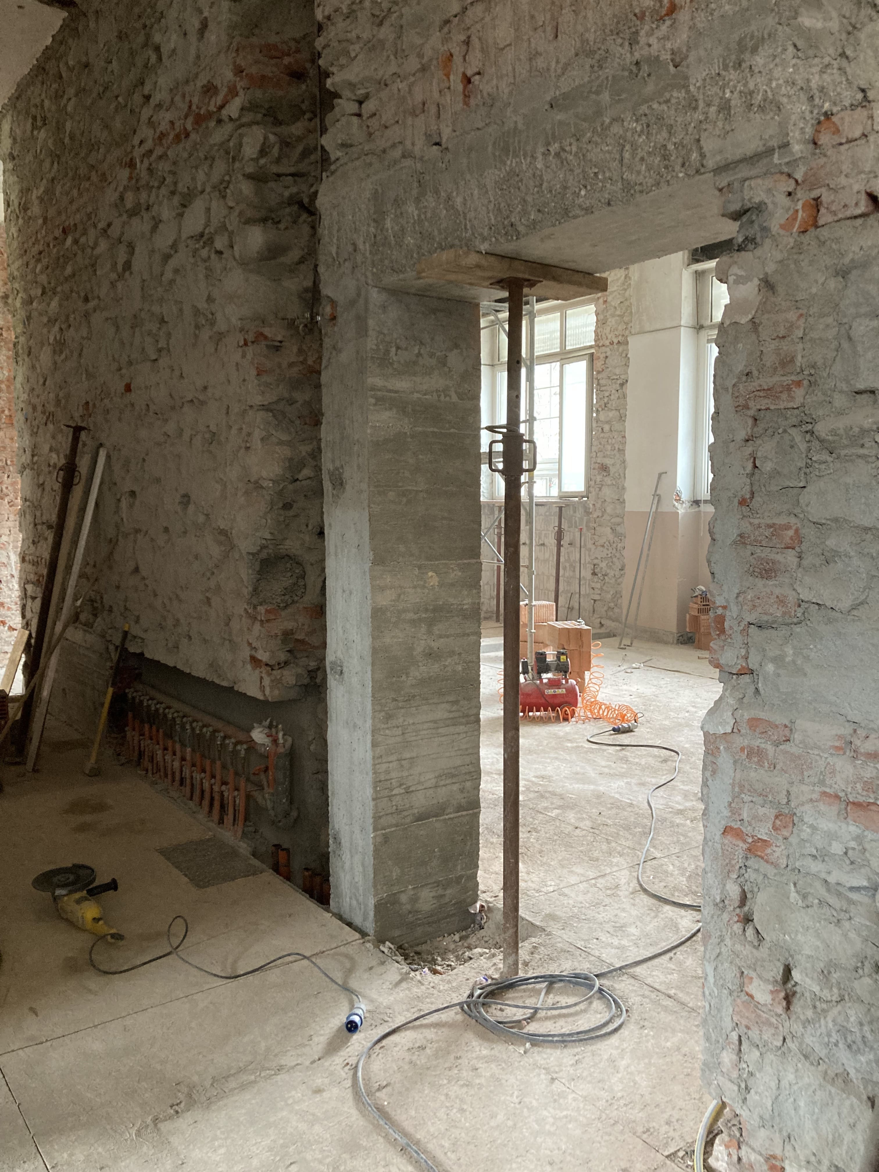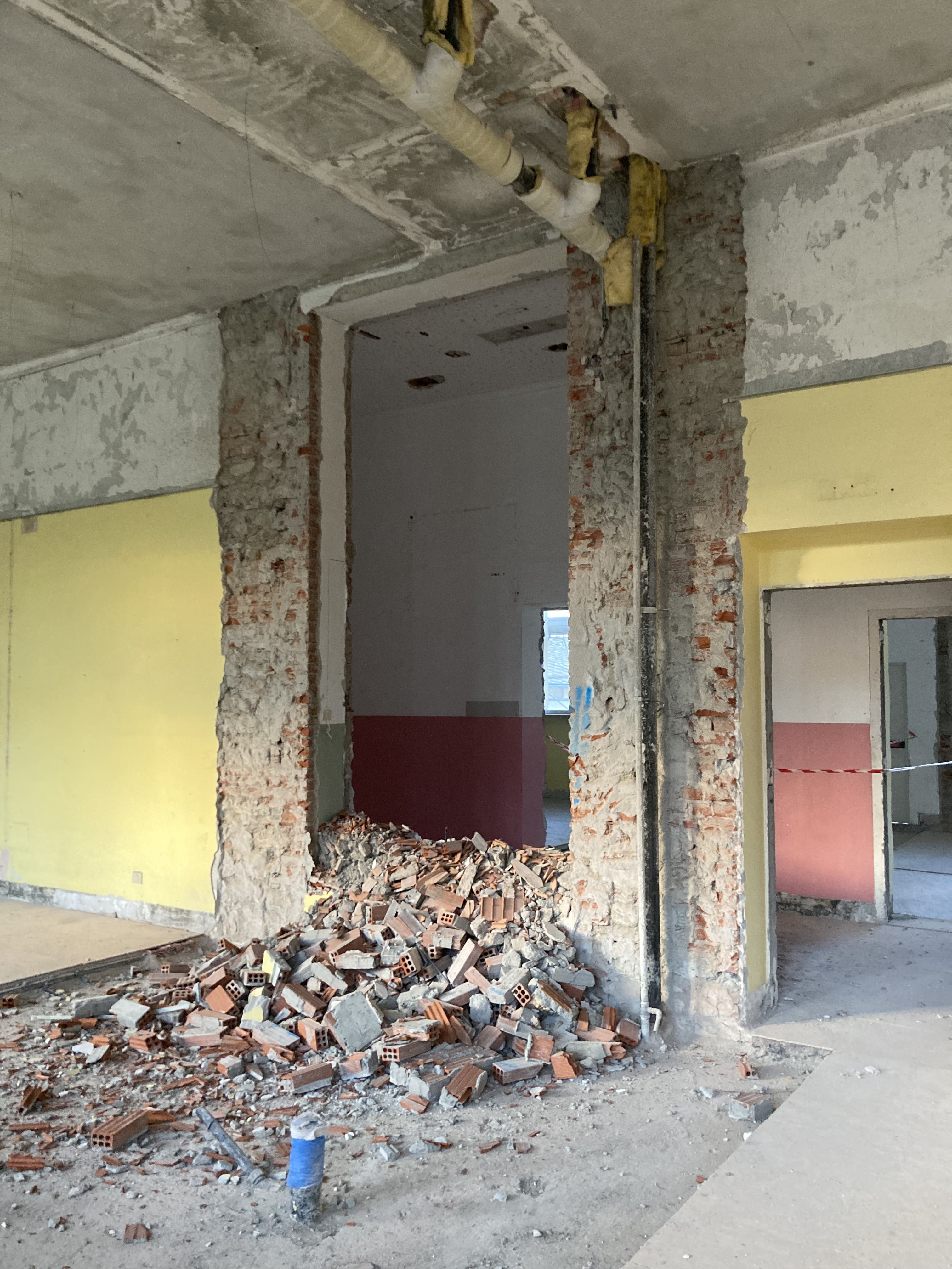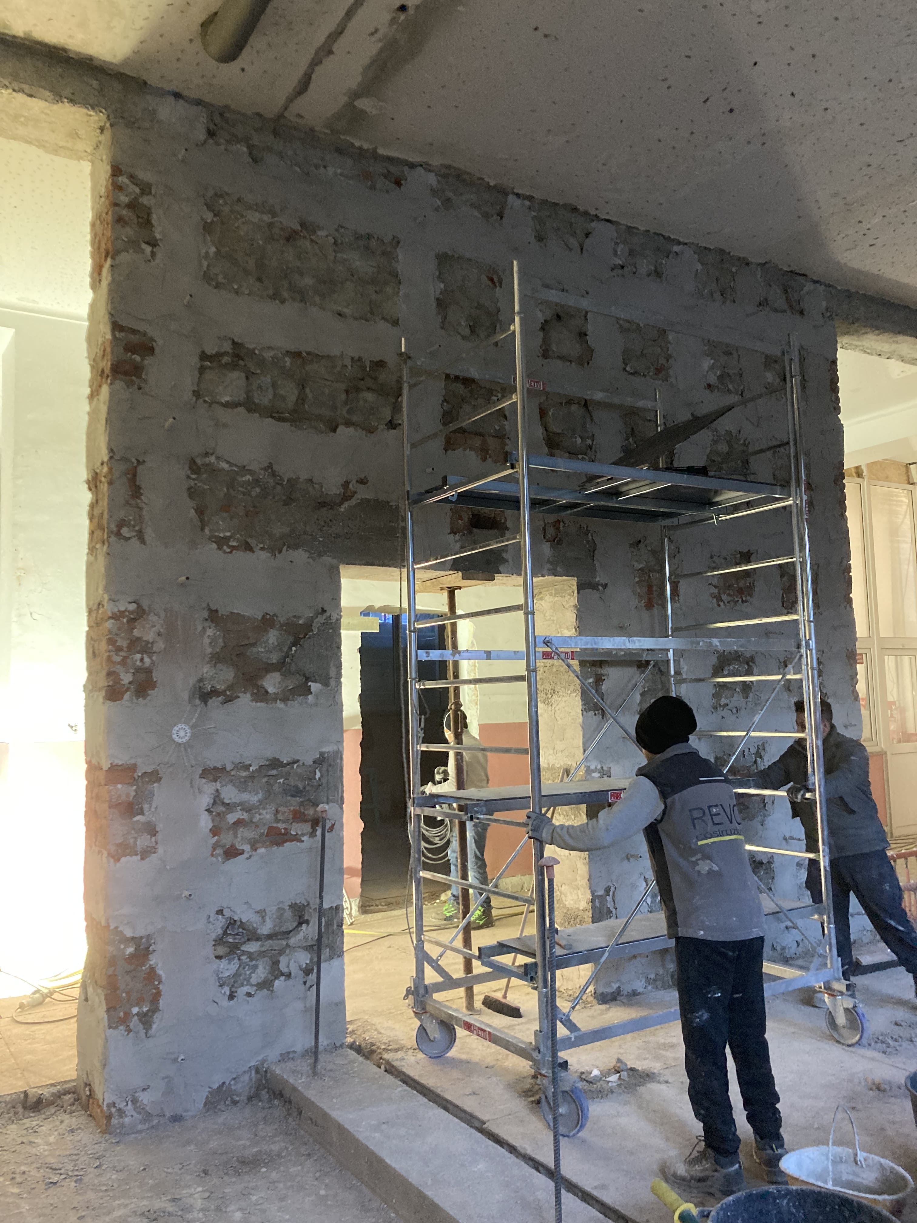 Les travaux prévus pour la consolidation du bâtiment se poursuivent. À ce stade, la mise en place de systèmes de renforcement structurel sur les montants muraux est en cours, afin d'améliorer la résistance du bâtiment en cas de séisme. Parallèlement, la réalisation de nouveaux linteaux en béton armé est en cours pour l'élargissement des ouvertures existantes. Les travaux de réalisation des maçonneries armées au rez-de-chaussée sont également en cours, ainsi que les démolitions ponctuelles des parties devenues inutiles, avec les opérations connexes de nettoyage des zones de travail et d'évacuation des matériaux de démolition.