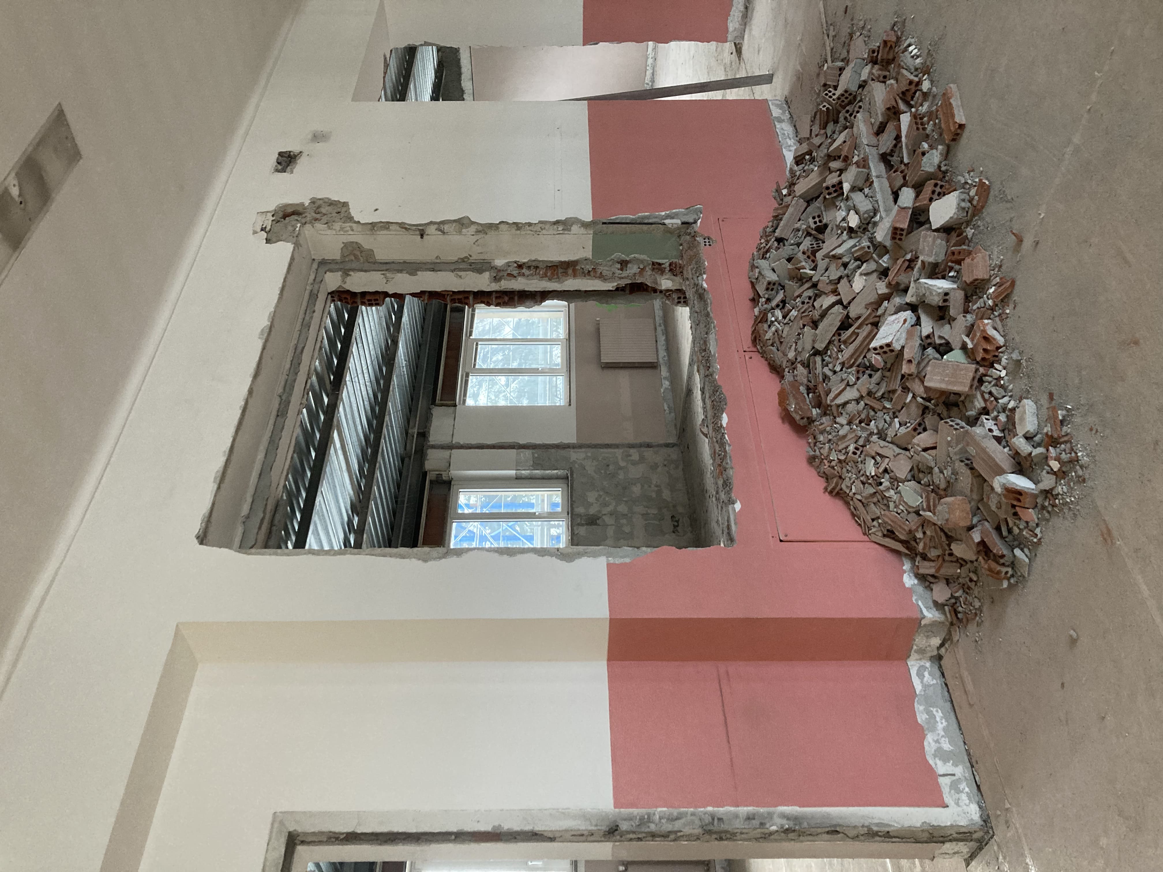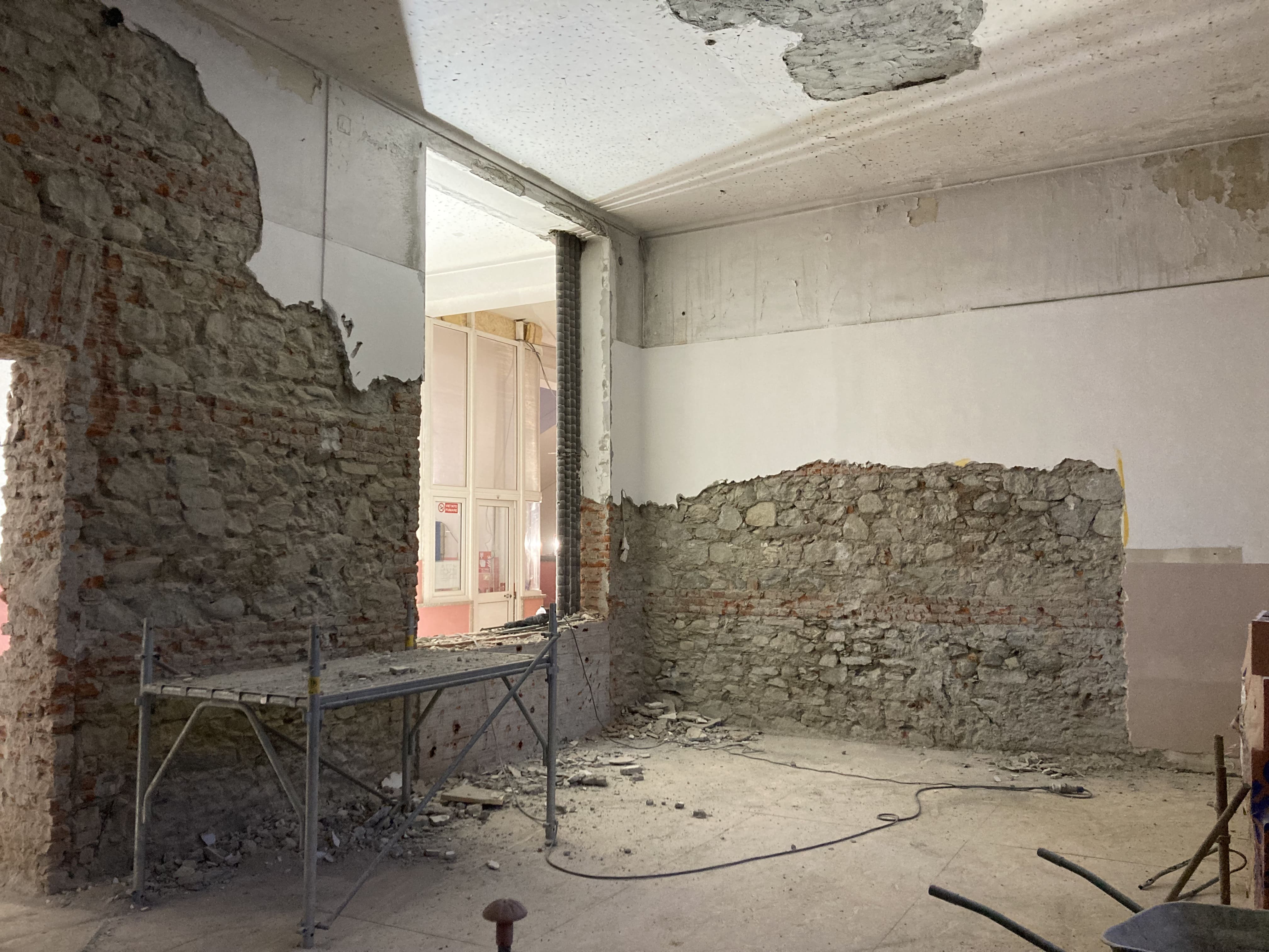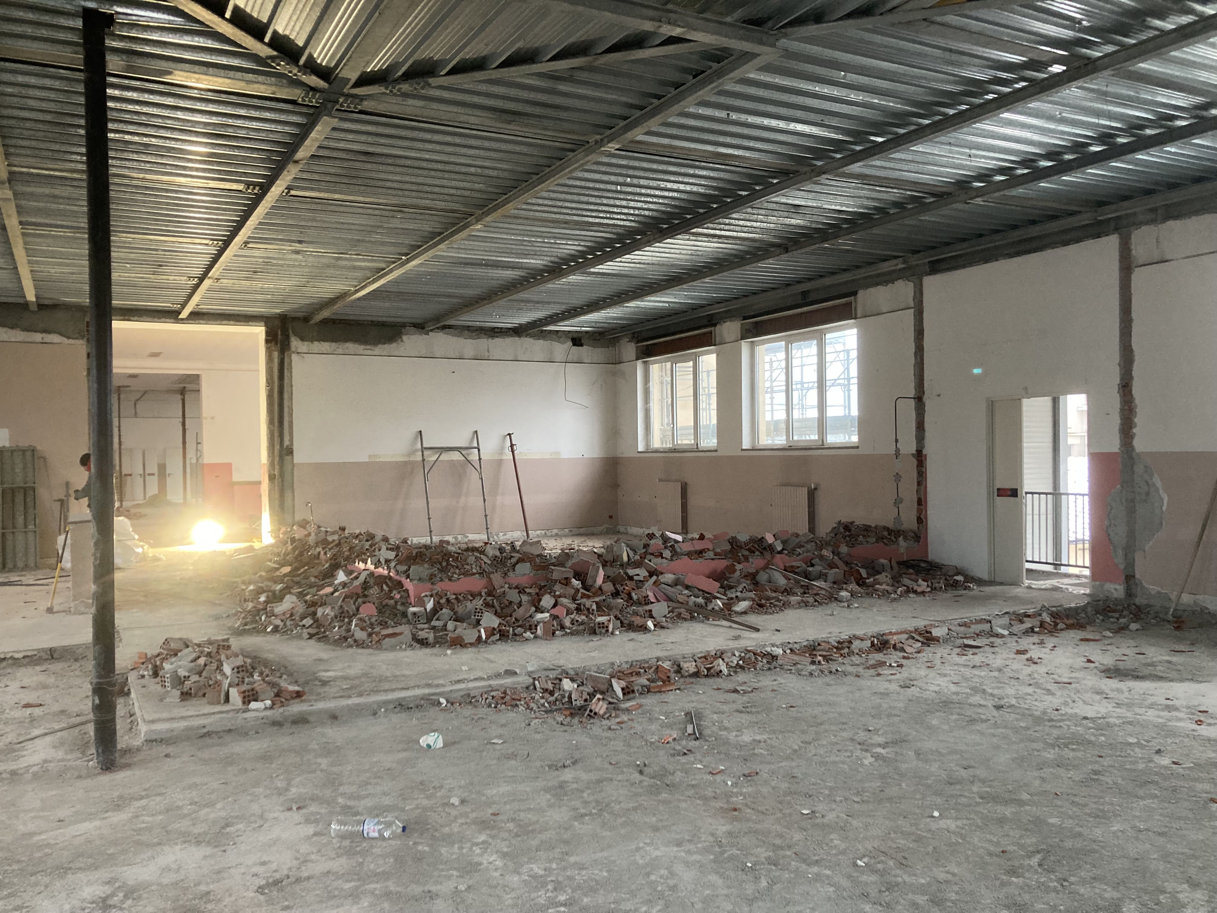 Le demolizioni interne si avviano verso la conclusione, con la rimozione delle tramezze al secondo piano. Le macerie vengono progressivamente raccolte e smaltite nel rispetto delle normative vigenti, mantenendo il cantiere ordinato e in sicurezza.